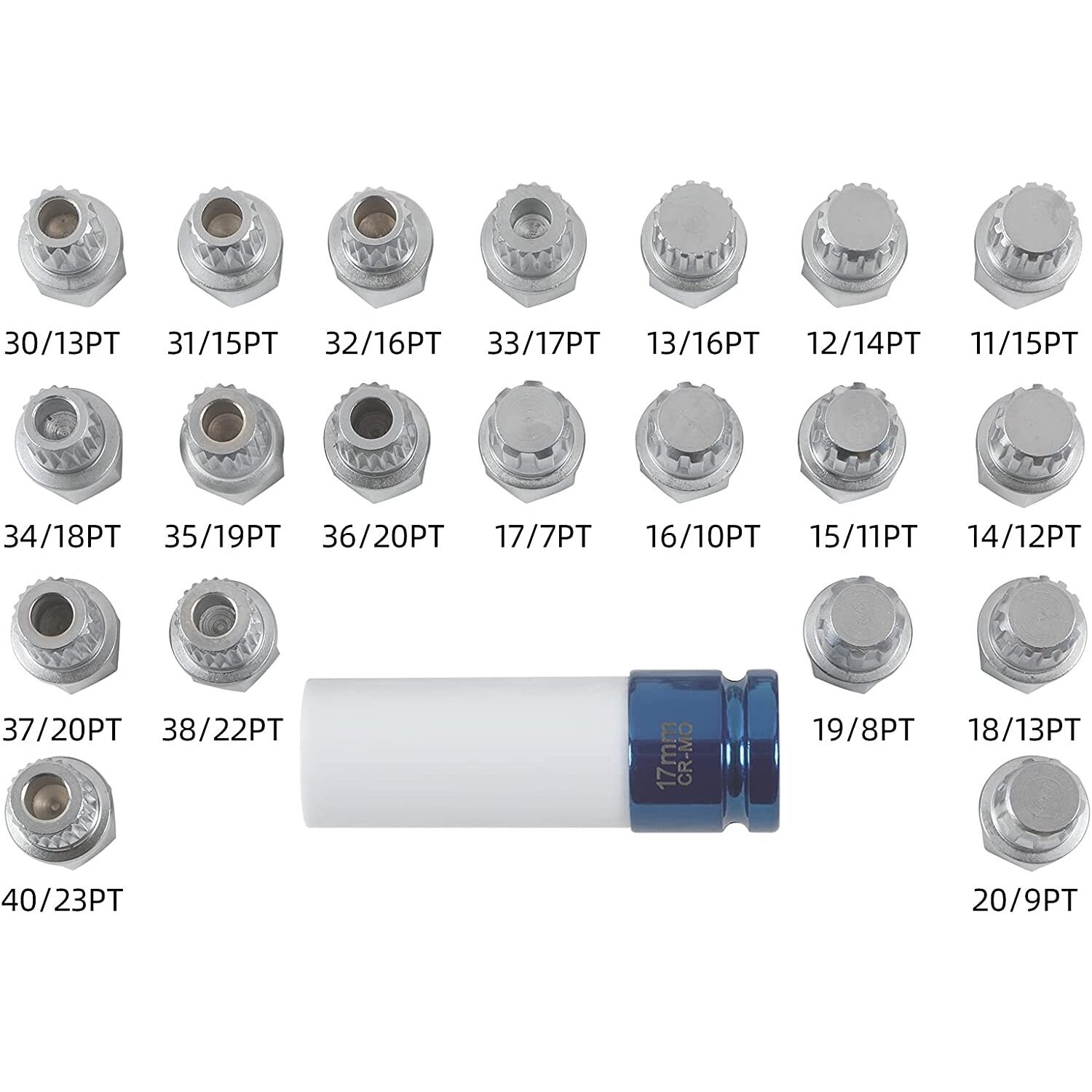 Šie splaina atslēgu komplekti tiek izmantoti, lai noņemtu riteņu skrūves uz lielākās daļas BMW un Mini modeļu: BMW: E12, E21, E23, E24, E28, E30, E31, E32, E34, E36, E38, E39, E46, E46/16, E46/2, E46/3, E46/5, E46/C, E52, E53, E60, E61, E63, E64, E65, E66, E67, E70, E81, E82, E83, E85, E86, E87, E90, E91, E92, E93, Mini: R50, R52, R53 un t.t.