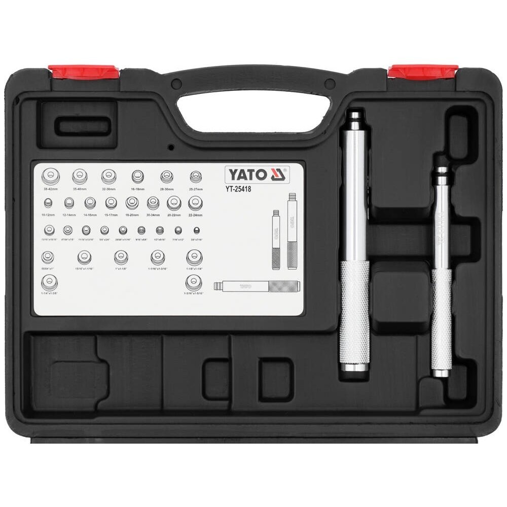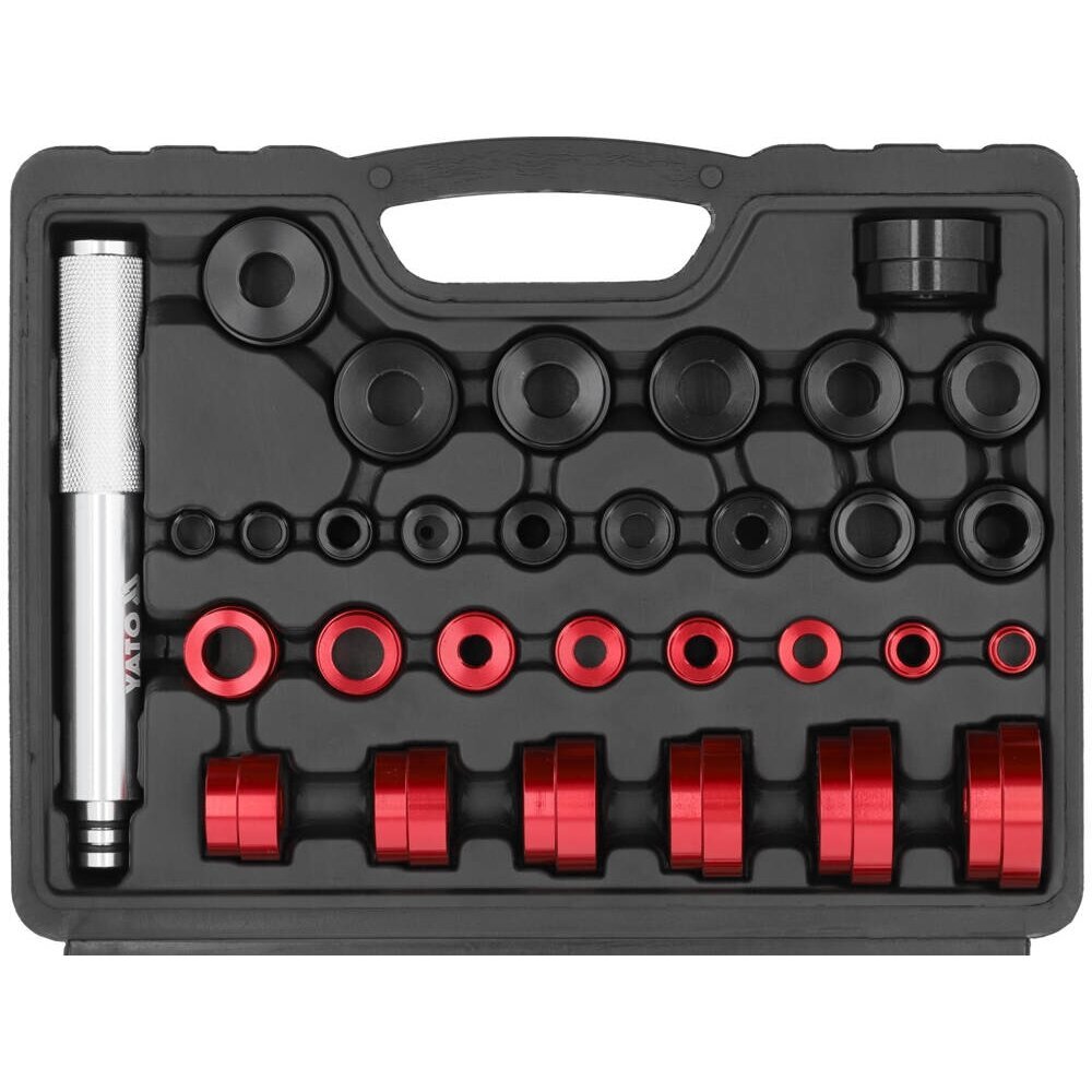 33 daļu komplekts ir paredzēts gultņu un blīvju uzstādīšanai. Tas sastāv no collas un metriskajām adapteriem.
