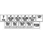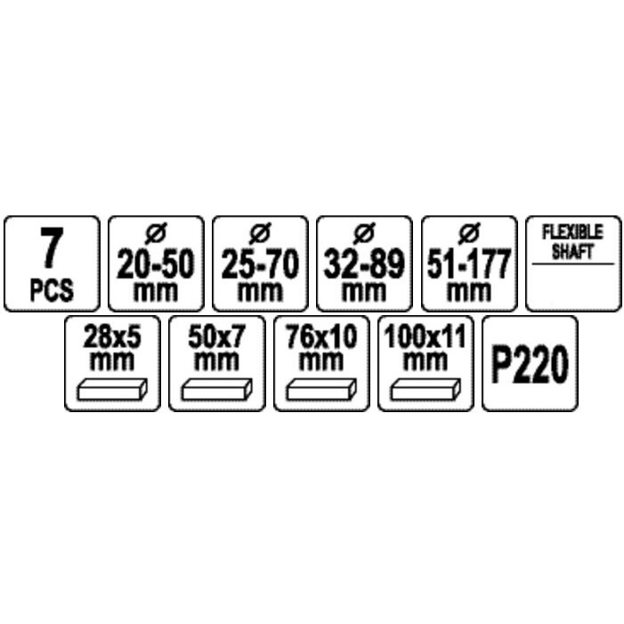 Komplekta saturs: trīsarmu hons ar akmeņiem (76x10mm P220), trīsarmu hons ar akmeņiem (50x7mm P220), divarmu hons ar akmeņiem (28x5mm P220), nomaināmi akmeņi x3 (100x10mm P220)