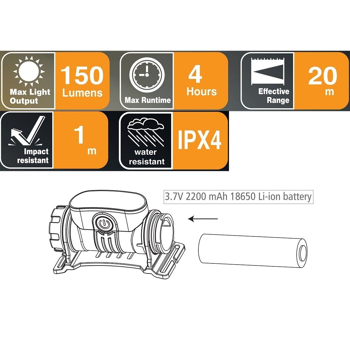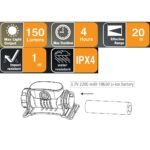 Gaismas plūsma spilgtā režīmā – 150lm, vājā režīmā – 50lm