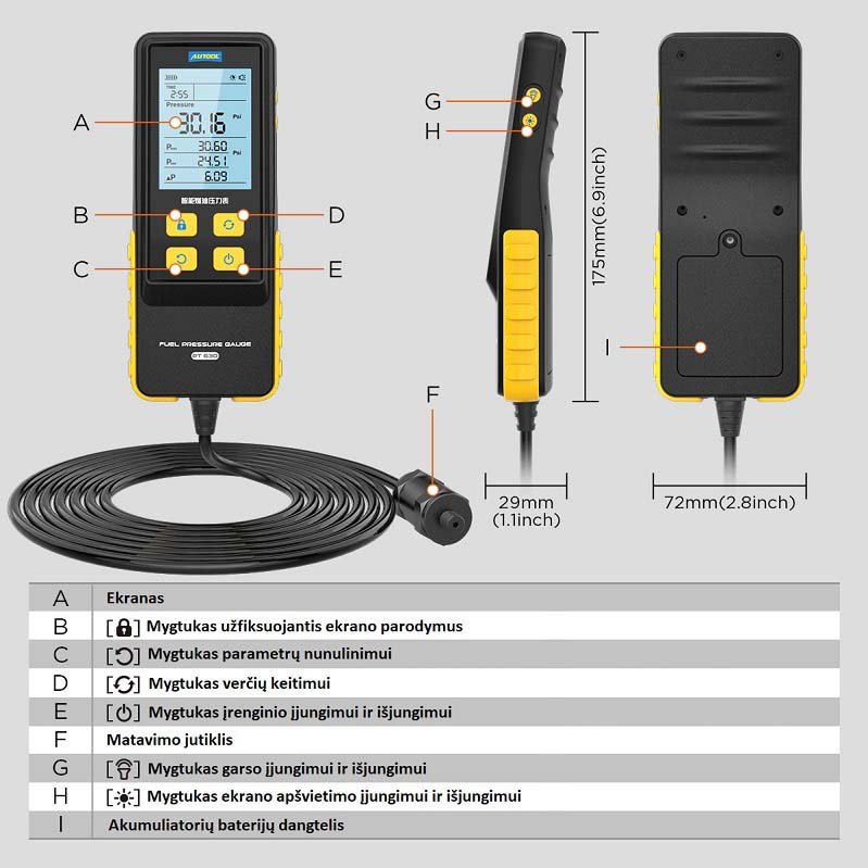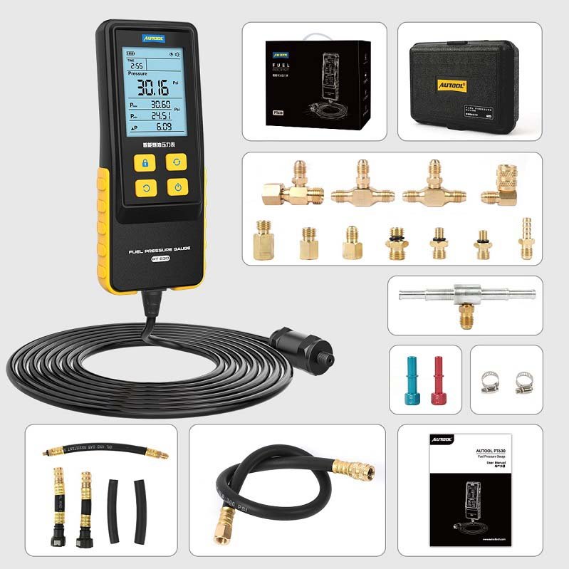 This fuel pressure measuring device is made of the most corrosion-resistant and high-quality materials, suitable for gasoline internal combustion cleaners. Compared to traditional fuel pressure gauges, the Autool PT630 has a detailed digital display that provides a much more accurate representation of the measured parameters to the user. It also has the ability to display parameters in three values and save captured readings. Using the Autool PT630 device, you will easily be able to measure the pressure of the fuel system of gasoline engines, identify possible problems of this system and make the necessary decisions for vehicle repairs.