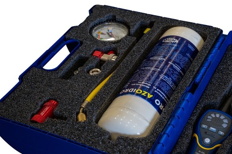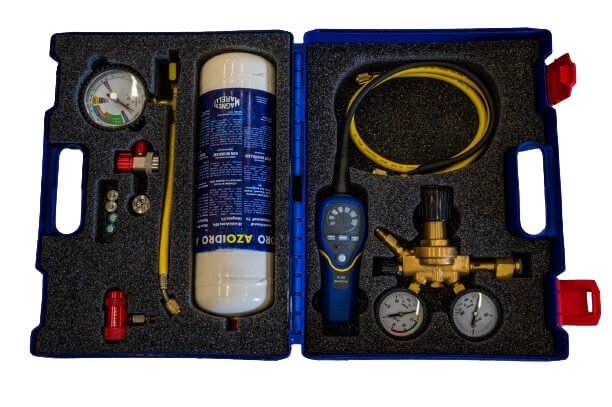 Profesionāls komplekts visaptverošai noplūdes pārbaudei automobiļu A/C sistēmās, kurās izmanto R134a un 1234yf aukstumaģentus. Šajā komplektā esošajam gāzu maisījumam (5 % ūdeņraža un 95 % slāpekļa) ir raksturīgas īpaši smalkas daļiņas, kas ļauj atklāt pat vismazākās noplūdes, kuras nav iespējams atklāt, izmantojot tikai tīru slāpekli. Komplekts ir iepakots izturīgā un ērtā pārnēsāšanas futrālī.