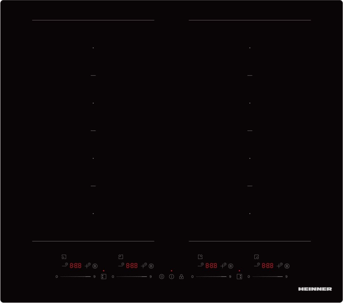 Iebūvējamā indukcijas plīts Heinner HBHI-M4ZB2FXSMTC , 4 gatavošanas zonas, tiltiņš, pastiprinājums, skārienvadība, taimeris, bērnu aizsardzība, atlikušās siltuma indikators, (P x Dz): 59 x 52 cm, melna