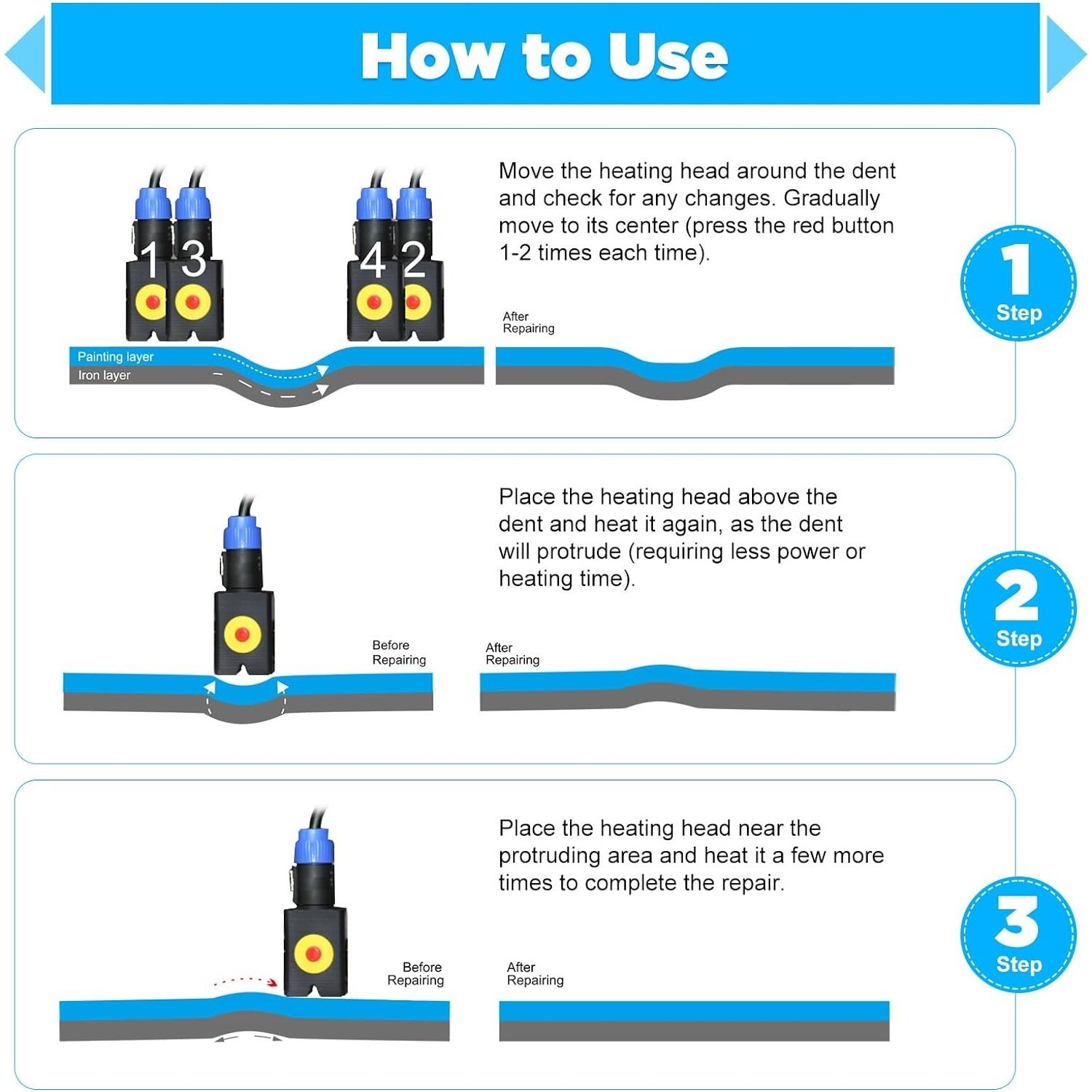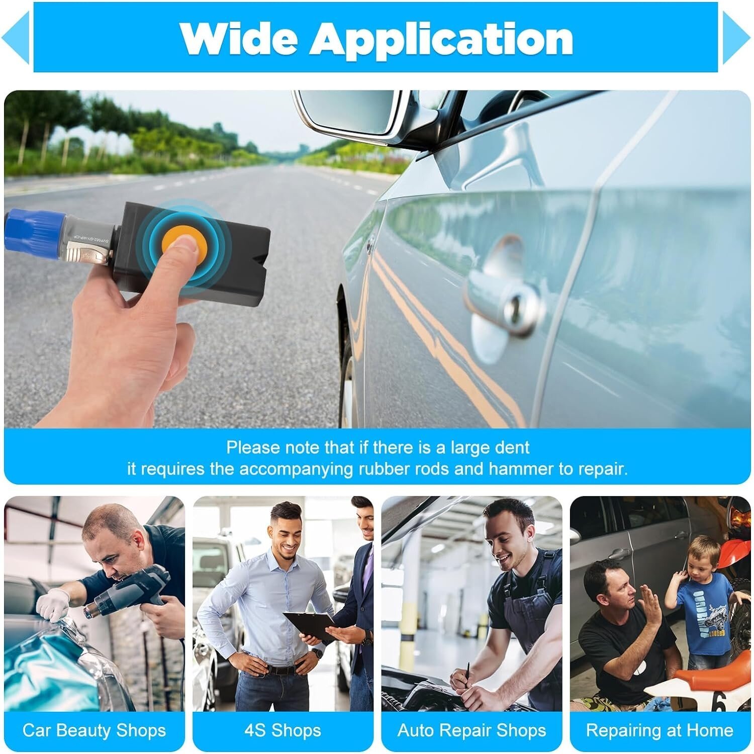 Maksimālā jaudas izvade 1.38KW, šis bedru labošanas instruments efektīvi labo nelielas bedres uz virsbūves un durvju virsmām. Tas ietaupa daudz laika remonta procesā.