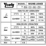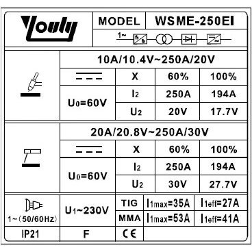 Strāvas diapazons TIG:10-250A; MMA:20-250A