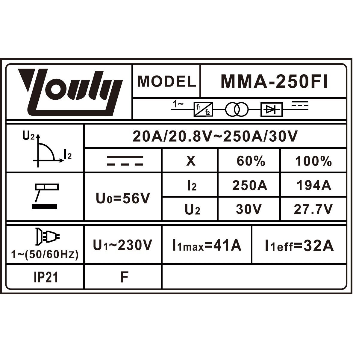 Slodzes jauda 60% darba ciklā 250 A / 30 V