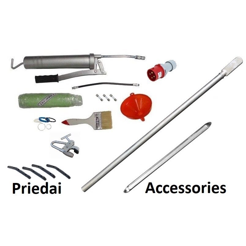Standarta piederumi: tauku pistole, diska knaibles, CE spraudnis, smērviela, piltuve, vārstu blīvslēgs, drošinātājs 3 gab., smērvielas ota, īss svira, garš svira, plastmasas sloksne 4 gab.