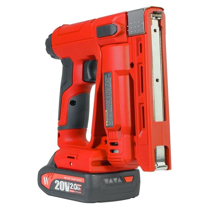 Komplektā iekļauts: Kombinētā bezvadu naglu pistole, 1 gab. Li-ion 20V 2.0 Ah akumulators, lādētājs, 4 naglu klipi un skavas, plastikāta kaste un lietošanas instrukcija