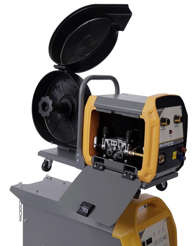 Šis HG MIG/MAG metinātājs ir aprīkots ar platformu gāzes balona piestiprināšanai. Tas arī ļauj viegli veikt dažādus metināšanas procesus, tostarp MIG metināšanu un metināšanu ar elektrodu. Modernā IGBT invertora tehnoloģija nodrošina, ka ML350YHG darbojas ar palielinātu jaudu un ļoti augstu darba ciklu. ML350YHG standartaprīkojumā ietilpst arī termiskā aizsardzība, kas kopā ar iebūvēto ventilatoru novērš pārkaršanu un nodrošina augstas kvalitātes metināšanas veiktspēju ilgstoši. Turklāt mobilais stieples padevējs ir aprīkots ar vadības paneli, kas ļauj viegli regulēt metināšanas spriegumu un strāvas stiprumu. Barošanas avots ir aprīkots arī ar iepriekš ieprogrammētām sinerģiskām programmām dažādu materiālu metināšanai. Karstā starta/pretaplipšanas funkcija ātri palielina metināšanas strāvu, lai novērstu elektroda pielipšanu pie apstrādājamā izstrādājuma ARC metināšanas laikā. Ideāli piemērots nerūsējošā tērauda, oglekļa tērauda, mazleģētā tērauda un alumīnija metināšanai (bez impulsa).