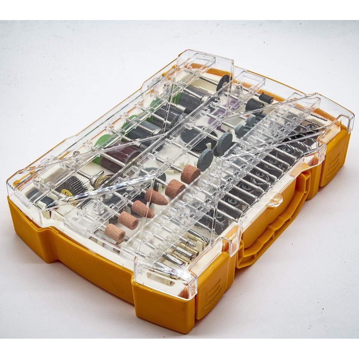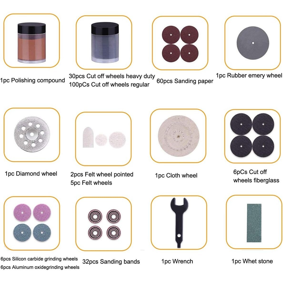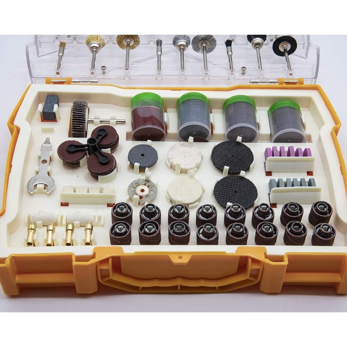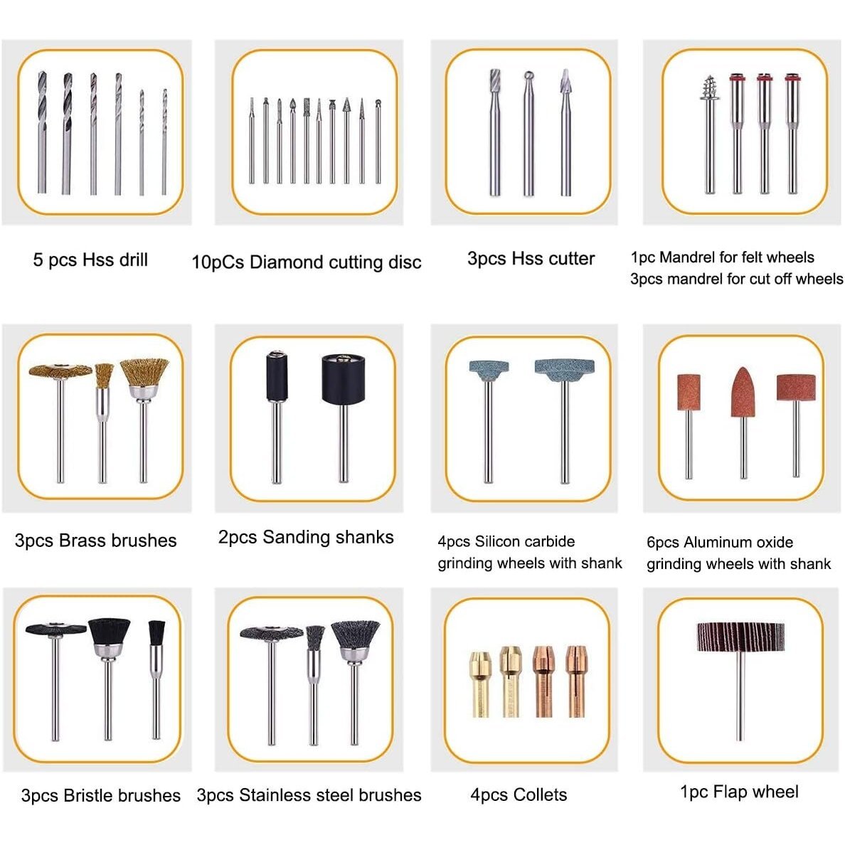 Komplektā iekļauti piederumi, kas ļauj veikt darbības, piemēram: izgrebšanu, gravēšanu, slīpēšanu, asināšanu, tīrīšanu, pulēšanu, griešanu un daudz ko citu