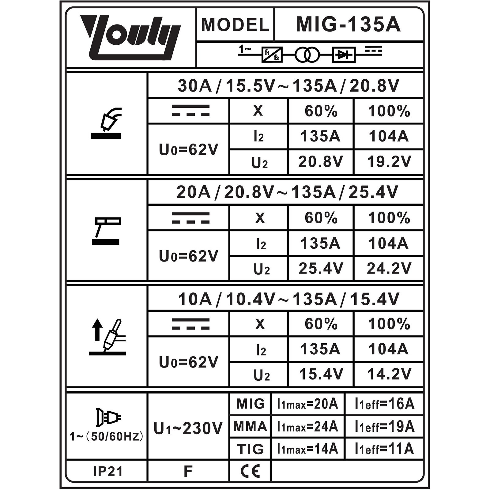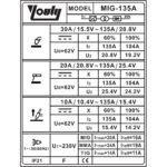 Izejas strāva MIG 30 – 135A, MMA 20 – 135 A / TIG 10 – 135