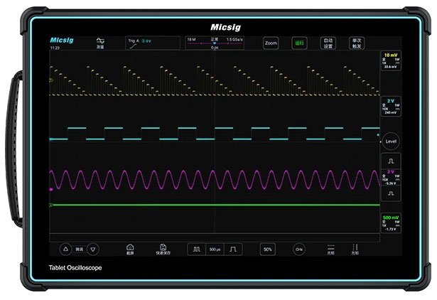 Piektās paaudzes Micsig planšetes osciloskopam ETO5004 ir līdz 500 MHz joslas platums, 4 analogie kanāli, nolasīšanas ātrums līdz 3 GSa/s un atmiņas dziļums 360 Mpts. Iebūvēta Micsig SigtestUI™ daudzfunkcionālā sistēma, kas nodrošina izcilu veiktspēju un profesionālas osciloskopa funkcijas. Īpaši lielais 14″ skārienjūtīgais ekrāns un iebūvētais lieljaudas akumulators padara šo instrumentu par ideālu instrumentu gan amatierim, gan profesionālim, sniedzot instrumenta īpašniekiem lielisku osciloskopa vadības pieredzi.
