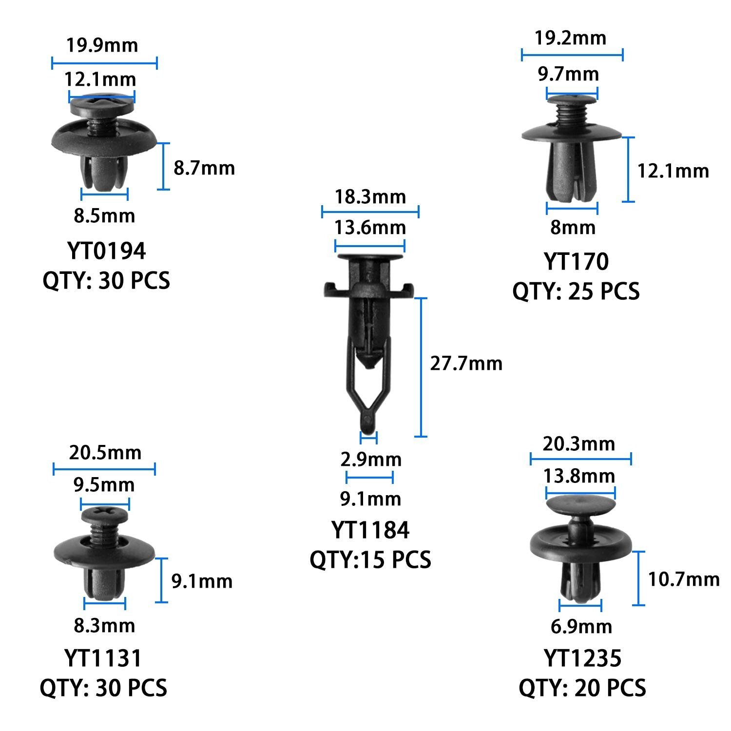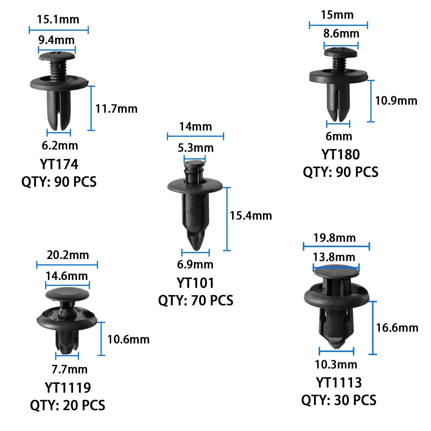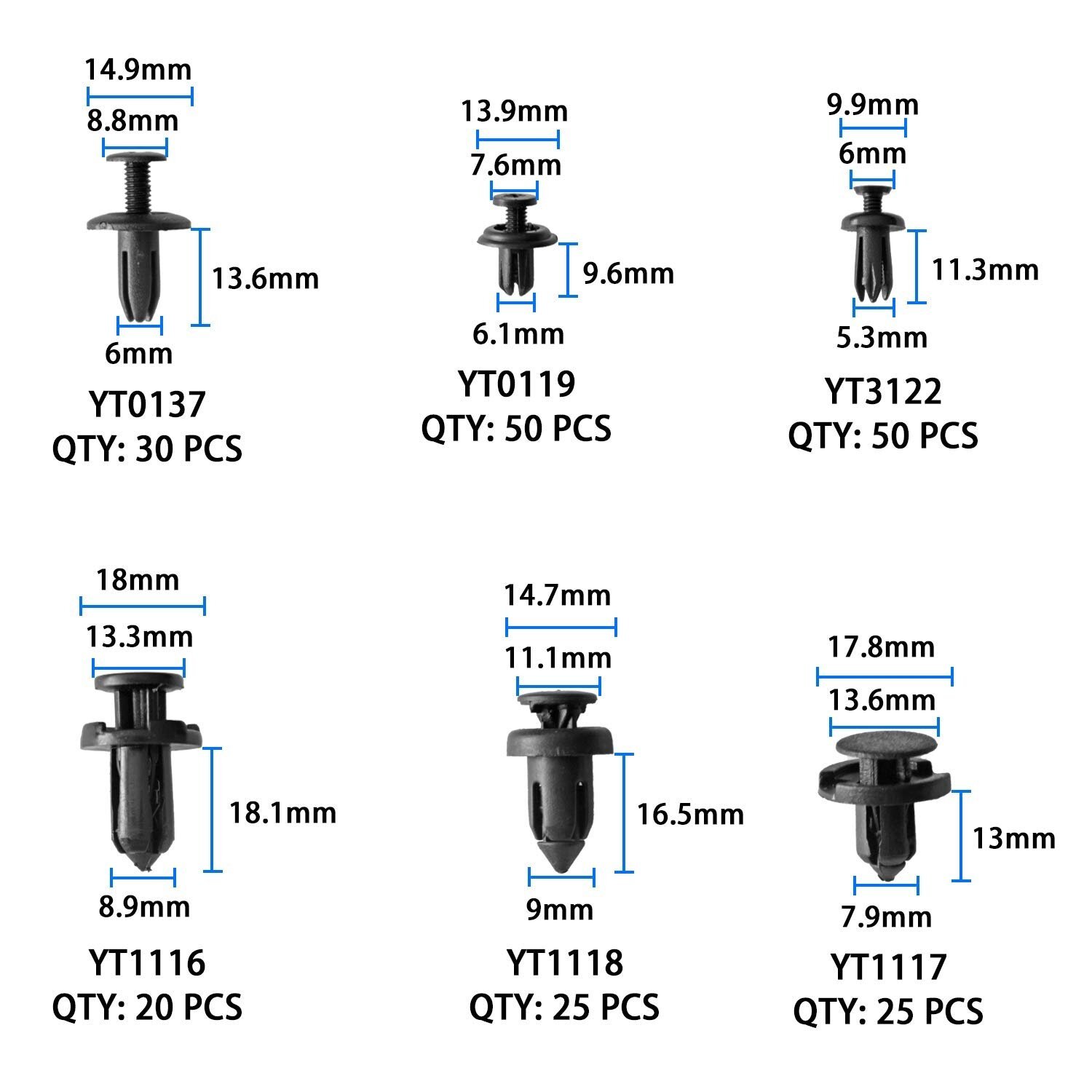 16 dažādu izmēru veidu, kas piemēroti apdares paneļu klipiem, durvju apdares klipiem, durvju paneļa klipiem, bufera klipiem, spārnu klipiem, motoru pārsegu un šļakatu sargu stiprinājumiem.