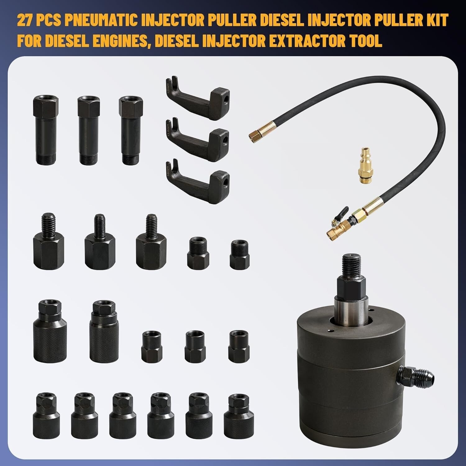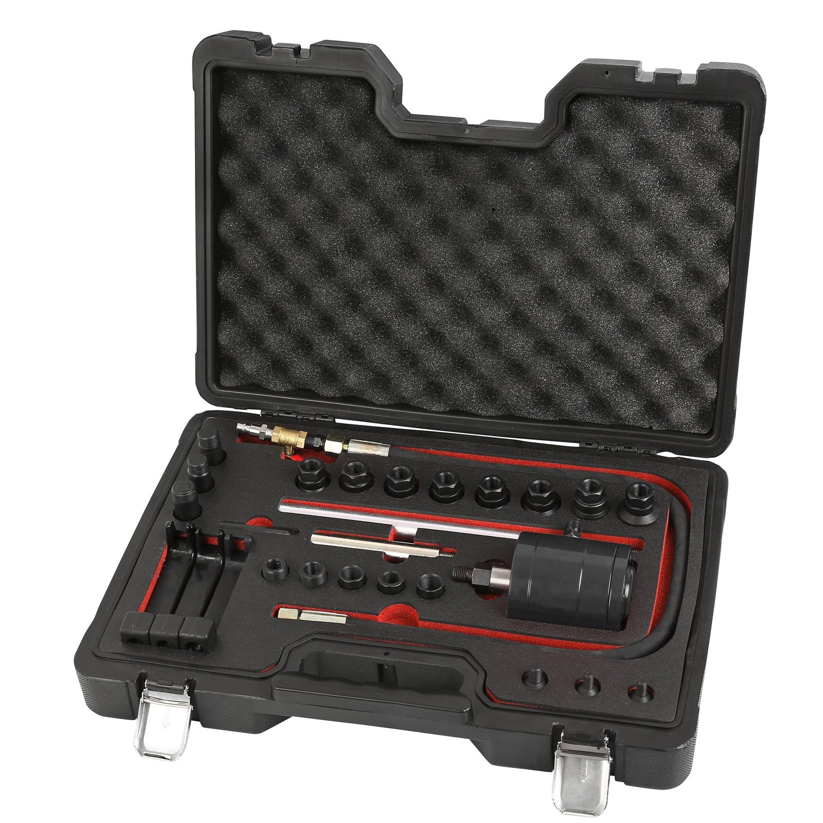 Komplekts ietver pneimatisko rīku, kurš izmanto vibrāciju un 20-30Nm griezes momentu, lai noņemtu pārāk stingri pieskrūvētus un iestrēgušus iesmidzinātājus. Pneimatiskais iesmidzinātāju izvelkšanas komplekts. Iekļauj izvelkšanas ierīci un vairākus adapterus, saderīgus ar dažādiem iesmidzinātājiem. Ar 3 vilkšanas āķiem (atvērumi 12mm/13.5mm/16mm) relatīvi dziļi pozicionētu iesmidzinātāju izvilktuvei, tādējādi tiek atviegloj to izvilšana.