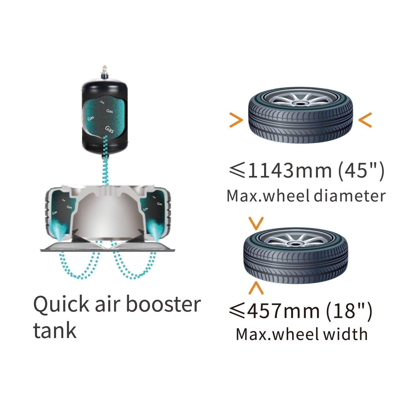 Maksimālais riteņa diametrs 45" (1143 mm)