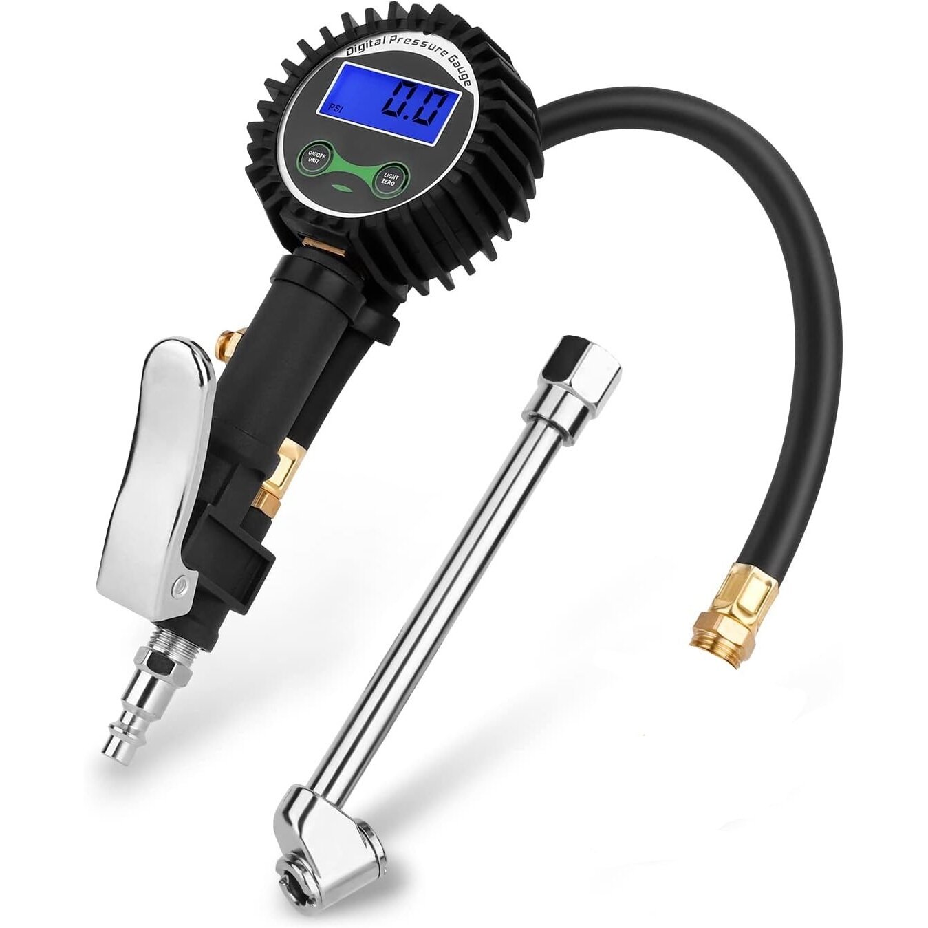 Manometrs LCD Ø 63 mm (2 x 1.5V AAA baterijas) Maksimālais spiediens 12 bar Šļūtenes garums 250 mm Piepūšanas galvas garums 140 mm