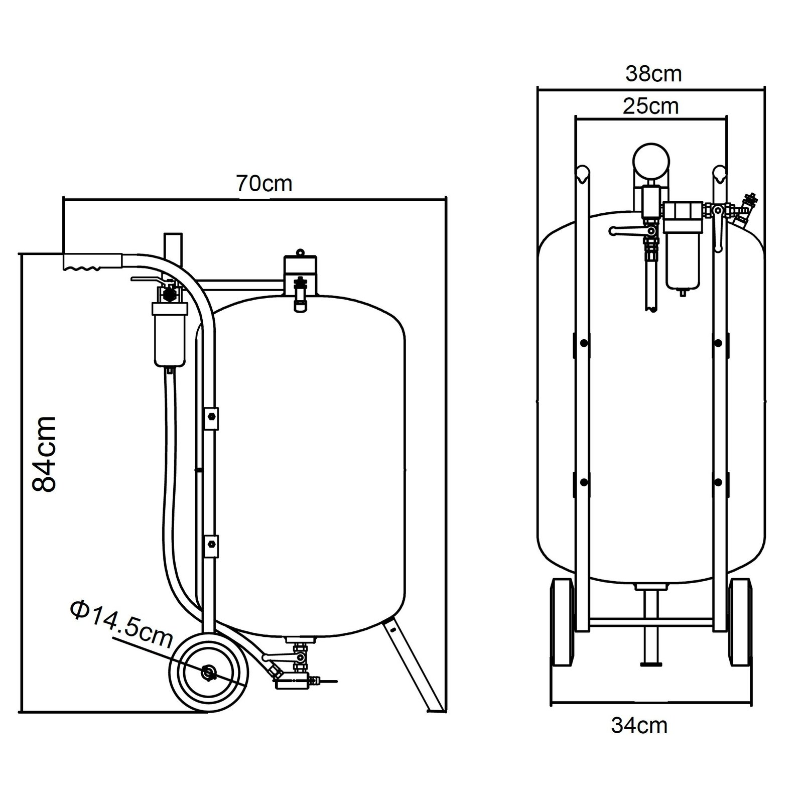 Jauda 75 l Darba spiediens 4 – 8 bāri Gaisa patēriņš 170 – 708 l/min Šļūtene L = 2.5 m Kopējie izmēri H x L x W 920 x 780 x 380 mm Svars 23.0 kg Iepakojuma izmērs 880 x 460 x 420 mm