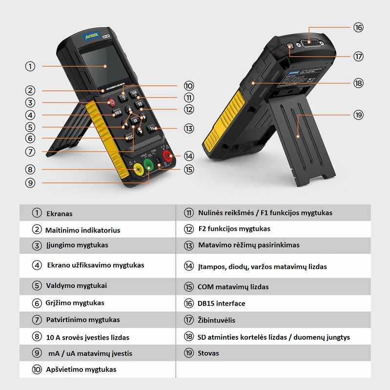 - Multimetrs: 1000 V līdzstrāvas un 700 V maiņstrāvas sprieguma noteikšana, 200 mA līdzstrāvas un maiņstrāvas strāvas mērīšana un iespēja mērīt pretestību un diodes vadītspēju.
