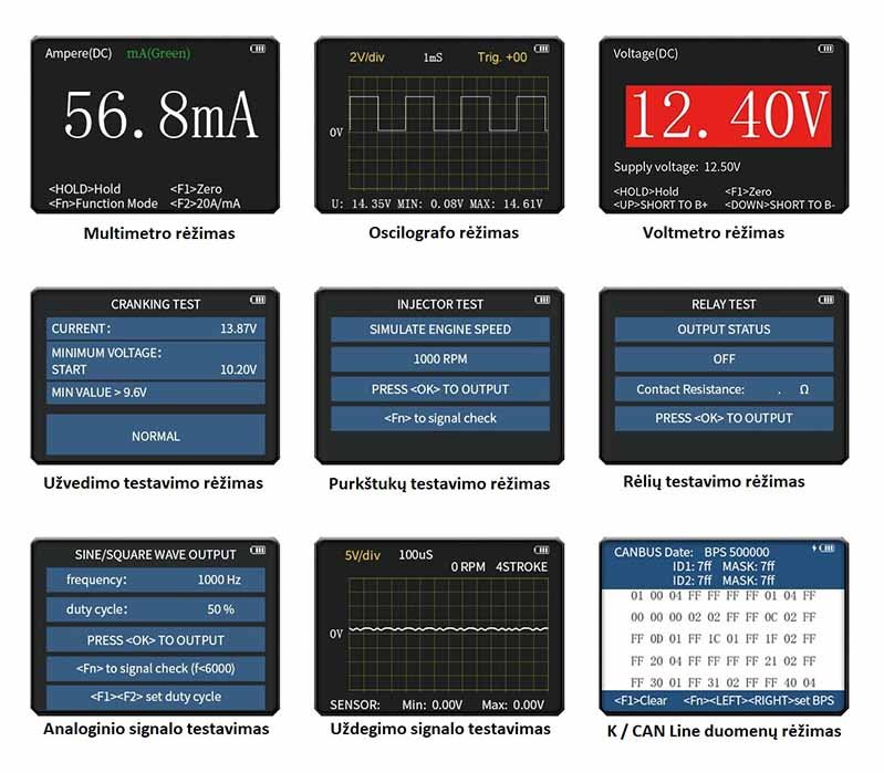 - Osciloskopa funkcija: mērāmā viļņu garuma diapazons ir 500 kHz. Izmantojot mainīgo skenēšanas frekvenci, varēsiet mērīt lēni mainīgus signālus, uzraudzīt transportlīdzekļu tehnisko stāvokli, mērīt un kontrolēt dažādu to ģenerēto signālu vērtības. Ierīce bez piepūles varēs nolasīt arī dzinēja piedziņas signālus, dzinēja jaudas spriegumu elektriskajos transportlīdzekļos, aizdedzes signālus, sadales vārpstas signālus, kloķvārpstas signālus, ABS sensora signālus, skābekļa sensora signālus utt.