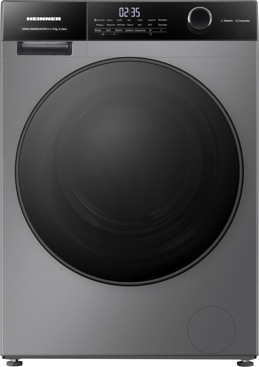 Veļas mazgājamā mašīna HWM-HMK9014IVTA+++, ietilpība 9 kg, centrifūgas ātrums 1400 rpm, energoefektivitātes klase A, invertora motors, 15 programmas, skārienvadība, digitālais displejs, 15 min ātrā mazgāšanas programma, alerģijas tvaika programma, baby steam care programma, mazgāšanas pabeigšanas aizkaves funkcija, papildu skalošana, priekšmazgāšana, veļas pievienošanas funkcija, automātiskā svēršana, iecienītās programmas atmiņa, temperatūras selectors, centrifūgas ātruma selektors, bērnu drošības slēdzis, izmēri (p × d × a): 59.5 × 61 × 84.5 cm, krāsa: titāna pelēka Parametrs Vērtība Produkts: Veļas mazgājamā mašīna Modelis: HWM-HMK9014IVTA+++ Ietilpība mazgāšanai: 9 kg Maksimālais centrifūgas ātrums: 1400 apgr./min Motora tips: Invertora motors Energoefektivitāte: A klase Programmu skaits: 15 Ātrā programma: 15 min Trokšņa līmenis mazgāšanā: ~52 dB Trokšņa līmenis centrifūgā: ~76 dB Vadība: Elektroniska ar LED displeju Atlikušā laika indikācija: Jā Tvaika funkcija (Steam Wash): Jā Aizsardzība pret bērniem: Jā Aizsardzība pret ūdens noplūdi: Jā Cilindra materiāls: Nerūsējošais tērauds Durvju dizains: Tumši tonēts stikls / Titanium Aesthetic Izmēri (P x Dz x A): 595 x 560 x 850 mm Krāsa: Titāna pelēka